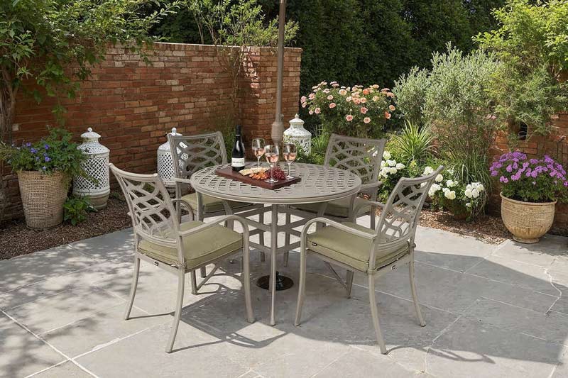 The Buxton 4-Seat Round Dining Set brings timeless elegance and comfort to your outdoor space. Featuring intricately designed cast aluminium chairs with plush, Weatherready® cushions, this set offers both durability and style. The coordinating round cast aluminium dining table provides ample space for outdoor meals, while the matching parasol adds shade and sophistication. Perfect for garden gatherings, patio dining, or leisurely afternoon tea.