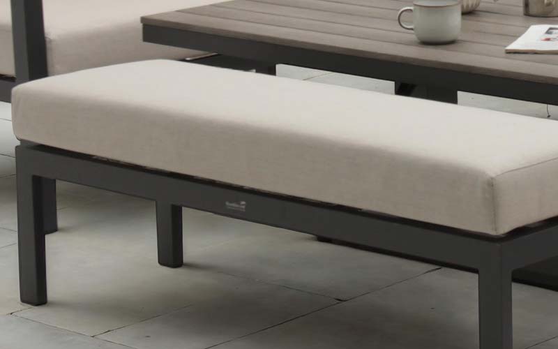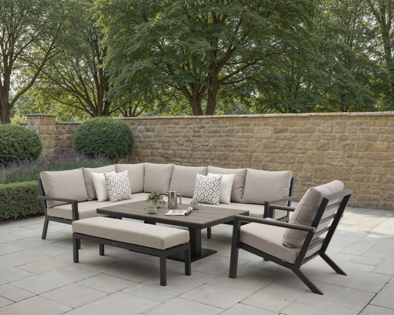 Combining generous seating with contemporary style, this Zurich set features a spacious L-shape sofa, co-ordinating sofa chair, and cushioned bench. The Anthracite aluminium frames are paired with season-proof cushions for lasting comfort, while the Tree-Free piston table with a table top in Nutmeg adjusts effortlessly between coffee and dining height. A versatile choice for both relaxed afternoons and sociable evenings outdoors.