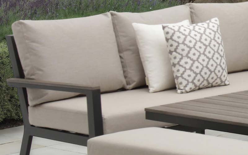 Our Eco Season-Proof cushions are made from recycled plastic bottles, combining sustainability with comfort. The soft-touch fabric is back-coated to prevent water ingress, while discreet mesh panels allow air to circulate so cushions dry quickly after showers.