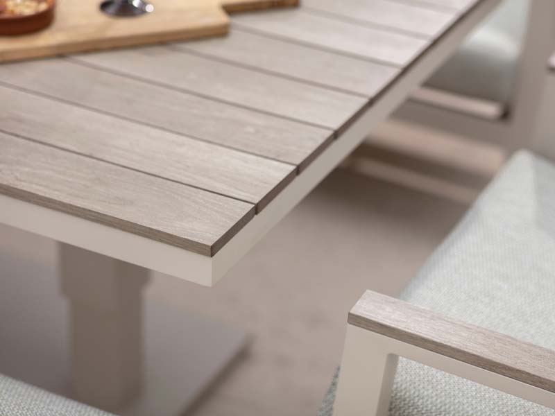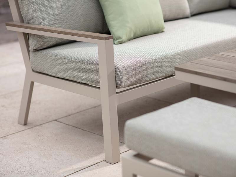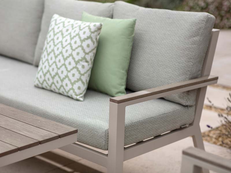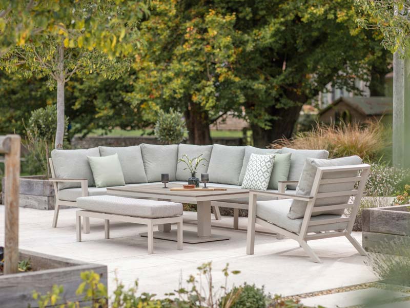 Combining generous seating with contemporary style, this Zurich set features a spacious L-shape sofa, co-ordinating sofa chair, and cushioned bench. The Mocha aluminium frames are paired with season-proof Eco Mist cushions for lasting comfort, while the Tree-Free piston table with a table top in Nutmeg adjusts effortlessly between coffee and dining height. A versatile choice for both relaxed afternoons and sociable evenings outdoors.