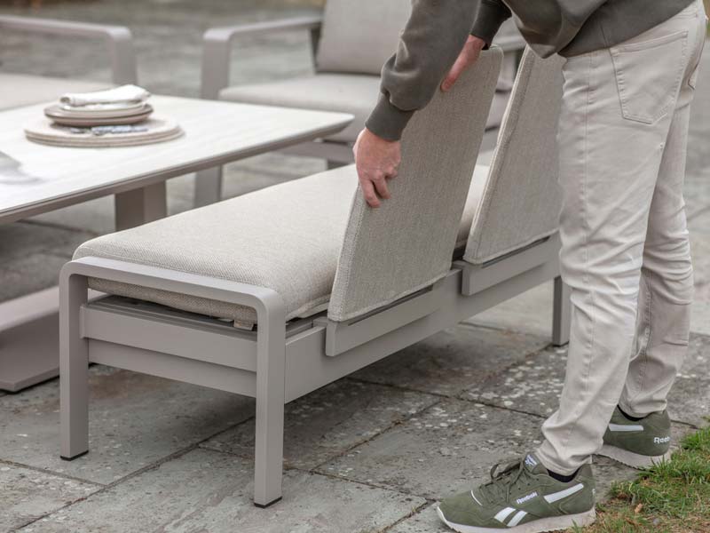 This lounge set includes a spacious three-seater sofa, two generously sized sofa chairs, and a bench with a removable back, paired with a rectangular adjustable piston table. Strong yet lightweight aluminium frames combine with season-proof cushions, creating a durable and stylish space for outdoor gatherings.