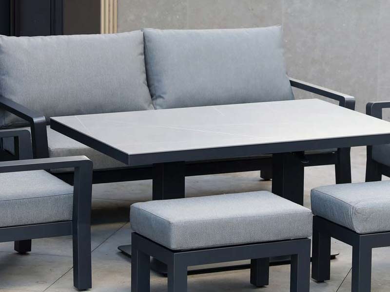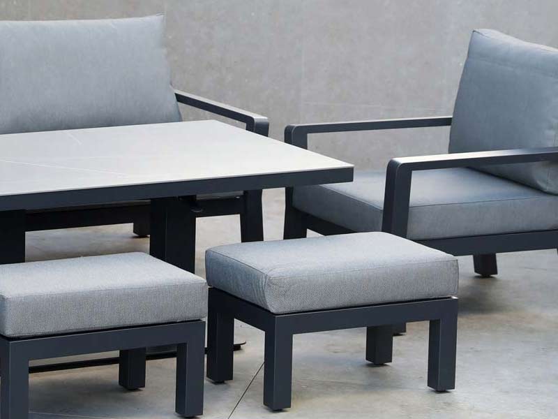 The robust aluminium frames, beautifully powder-coated in a stylish Phantom Grey matte finish, blend strength with modern elegance. Plus, the cosy Cobble Grey cushions are designed for comfort and durability, perfect for enjoying every season outdoors. The tables are topped with elegant Ashen Grey sintered stone, adding a touch of luxury and easy maintenance.