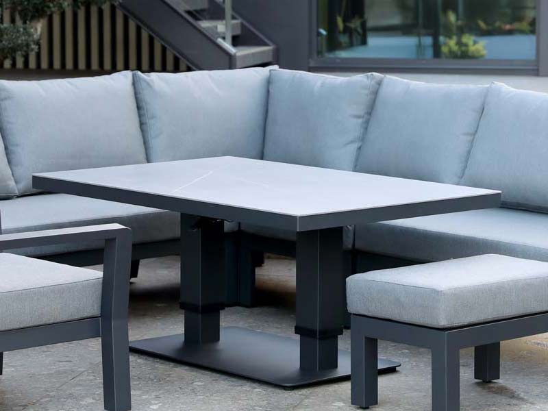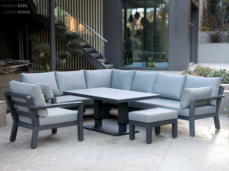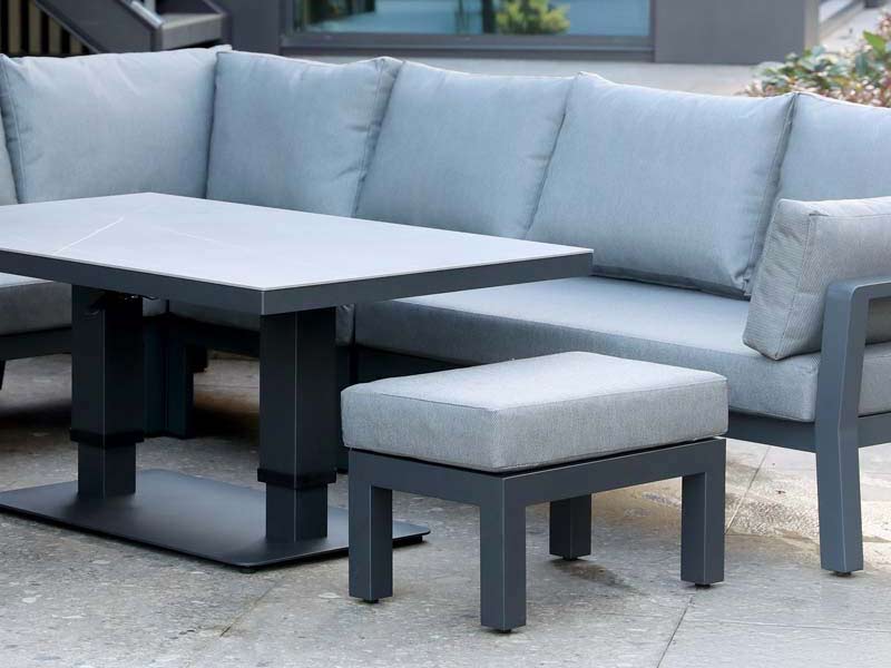 Style: The Como Corner Modular Set is the perfect aluminium furniture that truly transforms outdoor living, combining incredible durability with a sleek, modern design and versatile functionality. It features a variety of seating options, from a modular corner with a changeable middle section to the lounge chair and stool, all complemented by height-adjustable tables that adapt to your needs. The robust aluminium frames, beautifully powder-coated in a stylish Phantom Grey matte finish, blend strength with modern elegance. Plus, the cosy Cobble Grey cushions are designed for comfort and durability, perfect for enjoying every season outdoors. The tables are topped with elegant Ashen Grey sintered stone, adding a touch of luxury and easy maintenance.