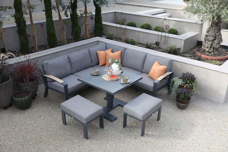 Style: Its modern style features stylish powder-coated aluminium frames paired with charming wood-effect heat transfer armrests. This inviting corner seating, paired with a stylish firepit table adorned with beautiful airbrushed glass, will wonderfully enhance your evenings, allowing for cosy moments to linger longer. Enjoy every moment as you share laughter and joy in this perfect setting designed for connection and celebration.