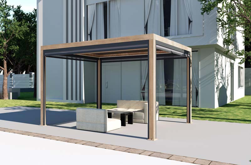 Supremo Belfort Pergola 3x4m with Curtains & LEDs Wood Effect