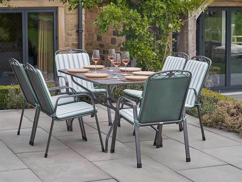 Style: The Savoy 6 Seat Rectangular Set is made with premium Steel in Dark Grey, making this set durable and hardwearing. The Savoy Chair Cushion features a modern stripe design with a sage green and white colour palette.